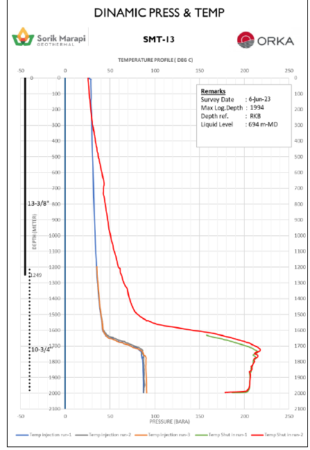 2023年6月7日,SMGP鉆井和資源團隊對耗時27天、于6月6日完井的T-13井進行了完井測試。測試數(shù)據(jù)顯示:T-13是一口高溫、高流動性的生產(chǎn)井,成功打出了因T-11修井失敗而損失的熱源。該井吸水指數(shù)在54.76kg/s/bar到94.12kg/s/bar之間,在停止注水后4.5小時后井下最高溫度即錄得217.9℃。其生產(chǎn)層穩(wěn)定在300℃的情況下,該井預(yù)計可生產(chǎn)190噸/小時的高壓蒸汽。
